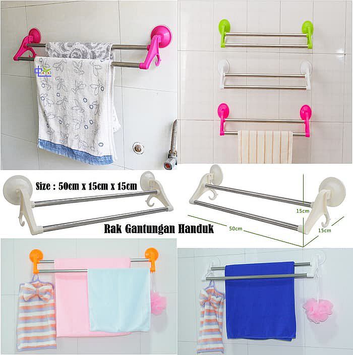 Handuk yang baru selesai dipakai tentunya masih basah, terutama handuk wajah yang baru selesai dipakai, jika tidak dikeringkan bakteri dan minyak yang baru dilap dari wajah jadi nempel di handuk, itu salah satu penyebab kulit wajah sering berjerawat. Sehabis pakai handuk, anda pasti sering menggantung handuk di hook gantungan, Handuk yang digantung di hook gantungan susah kering karena bertumpuk. Solusinya dengan memasang gantungan handuk tanpa paku. Gantungan handuk model baru, pasangnya tanpa paku, tanpa bor keramik. Kamar mandi jadi modern, serasa di hotel. Gantungan ini dapat dipasang di permukaan kaca atau keramik. Handuk yang selesai dipakai dapat dianginkan di gantungan ini, Gantungan handuk berbentuk panjang, terdapat 2 baris besi gantungan dari bahan stainless, anti karat. Handuk dapat dijemur melebar di gantungan ini, handuk gak bakal numpuk sehingga lebih cepat kering. Tempelan berbentuk karet hisap, daya hisap karetnya kuat, gak mudah lepas, cara pasang : - Lap bersih permukaan yang hendak dipasang, lalu keringkan - Tempel gantungan ke kaca / keramik - Tarik kedua ujung gantungan dari atas ke bawah Size : Panjang 50 cm